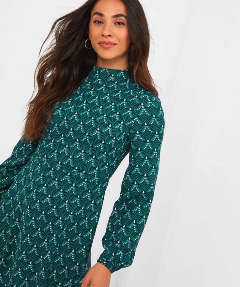 Everything about this Art Deco dress is so sleek and sophisticated. From the blue colour and sophisticated Art Deco pattern to the turtleneck and statement long sleeves, it all works together to create a style that you’ll really love to show off. Just throw it on with tights and boots for an easy-wear outfit that oozes effortless elegance.