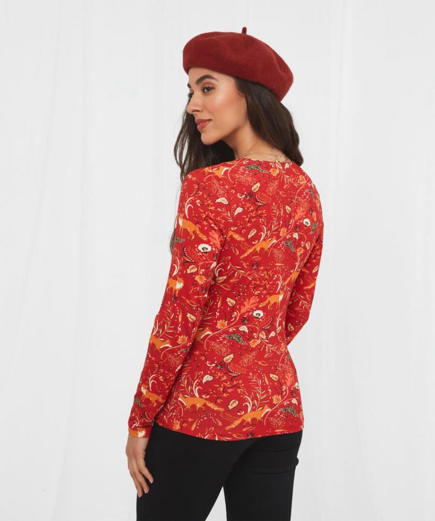 This pretty, playful fox print top is packed with personality. Finished in a wrap design with a gently draped neck, this fabulous top is so flattering and feminine. Check out the cute little guy dotted all over – so fun and foxy, he’ll love joining you on all your autumnal adventures.